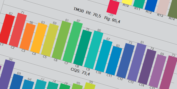 Bereits jetzt verfügbar ist eine neue Version der „Light Inspector“-Software. Sie beinhaltet erstmals die Unterstützung des neuen „TM30“-Standards zur genaueren Ermittlung der Farbtreue von Leuchtmitteln (IES-Video). Hier werden 99 Testfarbtöne zu 16 Indizes zusammengefasst (Screenshot-Ausschnitt oben). Zum Vergleich: Der „allgemeine Farbwiedergabeindex“ berücksichtigt nur acht Messfarben, die erweiterte CRI-Palette 14 bis 15.